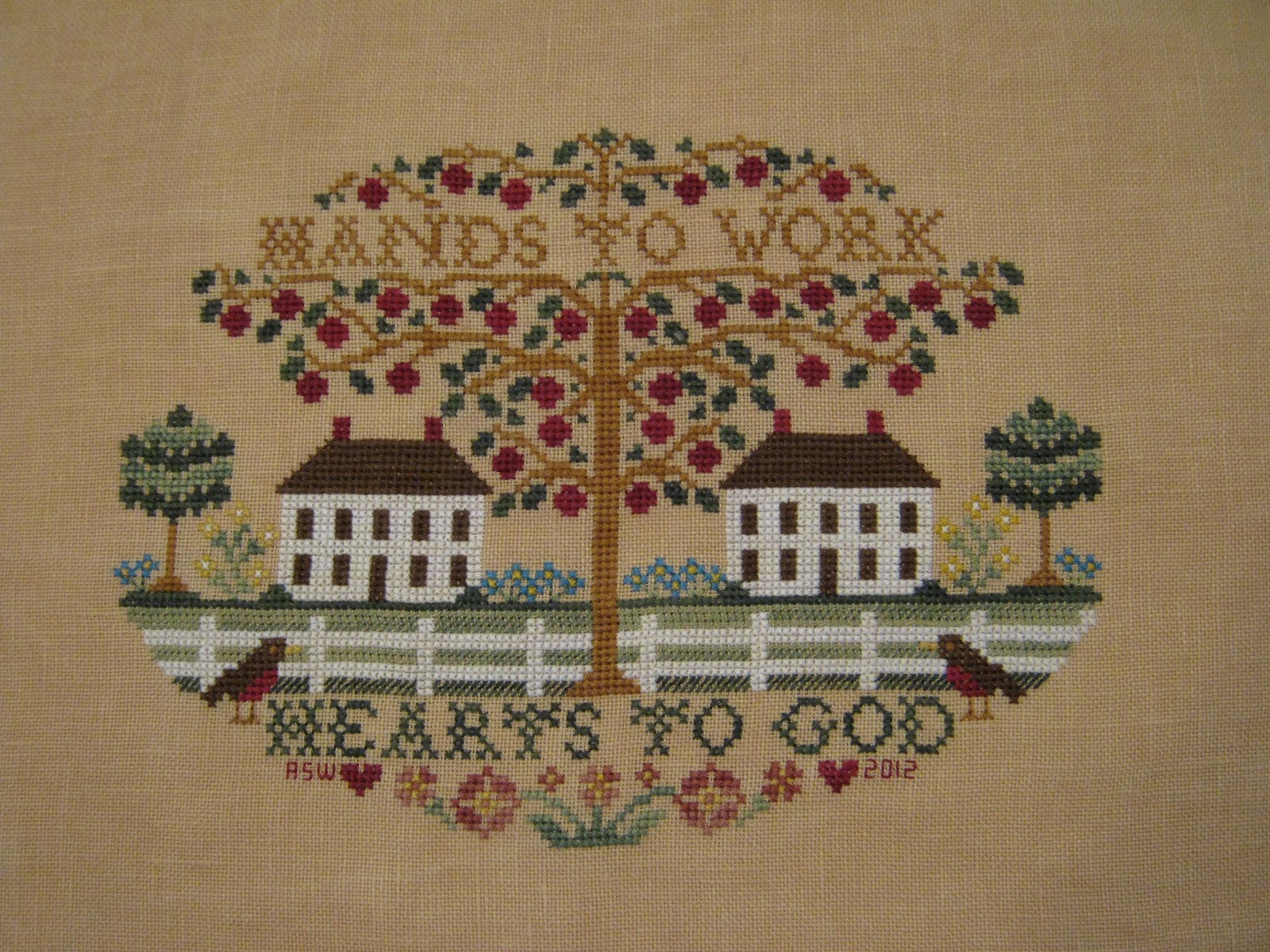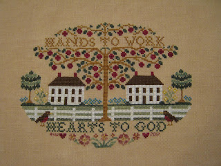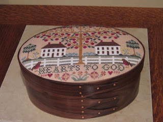 This is Blue Ribbon Designs "Beauty In Simplicity" stitched for the beautiful Oval Shaker Box (which I have!) made by the Canterbury Box Shop. I stitched this one this past week, finishing it up yesterday evening. I can't wait to get it "finished" - I'll post a picture of it again when I do. I love this design and it didn't hurt that it was designed for a shaker box, which I adore as well. The design is also available is a slightly different version to be framed if anyone is interested. AND it comes with smalls that you can stitch & put in the box. I might do those too... they're on my long & ever growing "list". It's stitched on 32 ct Vintage Examplar from Lakeside using WDW floss (I did change one color - the flowers on the bottom are Red Pear instead of Bluecoat Red).