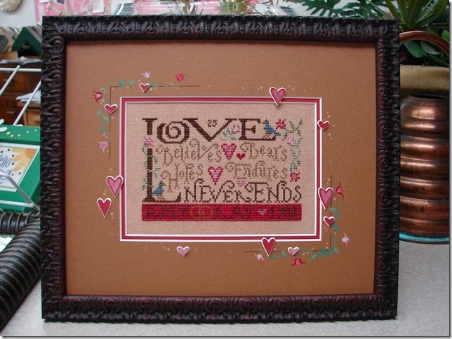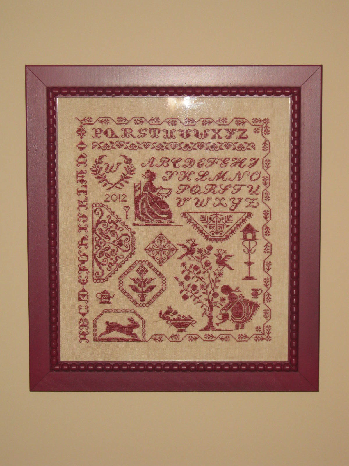 Design is by Silver Creek Samplers, finished in Jan. 2013 for our 25th Anniversary & framed by Jill Rensel.