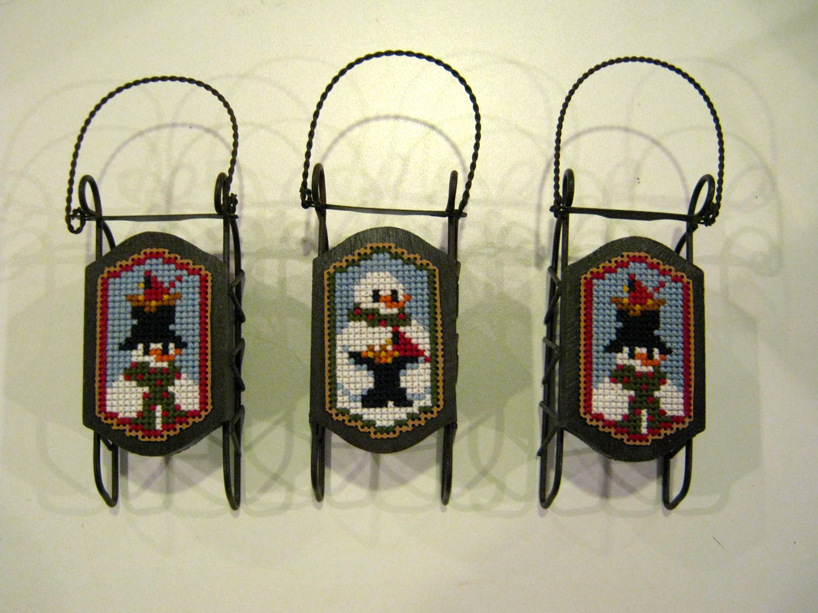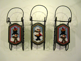 These I just finished last night. Looks like I need to straighten the wire a bit on some of them. They're by Dixie Darlin' and my mom fell in love with the ones that Donna K. stitched for the ornament exchange in MB. I ordered some to stitch and some to give her to stitch for my sister and me. :-) She doesn't know it yet though, I plan to give them to her on Thanksgiving. The first two are for her & the 3rd for my sister. The come in sets of 3 sleds and the patterns each have 3 designs. As you can see, I stitched one of them twice. Please excuse the shadows. The camera batteries died after snapping the photo & I'm too lazy this a.m. to redo. I think you can get the idea from the pic - they're cute!!