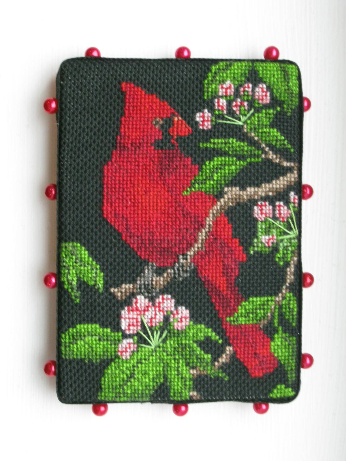 This beautiful cardinal was stitched by my friend Char, over 1 on 28 ct black. I paid her to stitch it for my mom for her birthday because I can't see to stitch on black at all. My mom loved it - it's really beautiful. I finished it into a pinkeep because she likes pinkeeps. Thanks again Char, it's LOVELY!