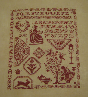 The first is the A Mon Ami Pierre sampler from Le Temps Qui Passe that I started in January. It's stitched on 36 ct Vintage Light Examplar Lakeside using one strand of DMC 815