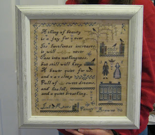 This I didn't stitch either, but it's now hanging in my house. Isabella from The Primitive Hare joined us at the Pals Retreat in Oct. When she was packing up to go home, she wanted to sell a few of her larger models. Since I can't possibly (EVER) stitch everything I want, I decided why not! I LOVE this design & now I will think of sweet Isabella & the time we spent together in MB everytime I look at it. Ray just framed it a few days ago.... isn't it lovely? It's called Endymion and it's stitched on 40 ct. Thanks again Isabella, I love it! Are you ready for more pancakes and DQ? ;-)